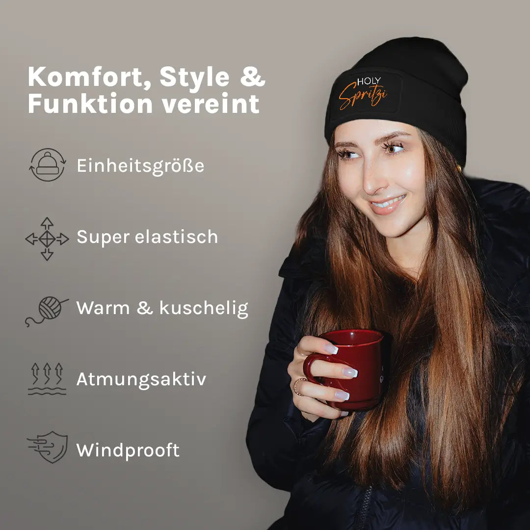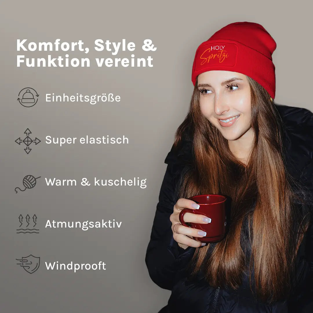 Ein Glühwein in der Hand, Freunde an Deiner Seite und die Beanie auf dem Kopf – so macht Weihnachtsmarkt richtig Spaß! Während Dich der doppellagige Strick zuverlässig warmhält, bringen die frechen Sprüche auf dem Patch garantiert Lacher. Egal ob beim Anstoßen, Schlendern oder Singen – Deine Mütze sorgt für gute Laune, warme Ohren und das perfekte Winterfeeling. Prost auf gemütliche Abende voller Spaß, Glühwein und unvergessliche Momente!