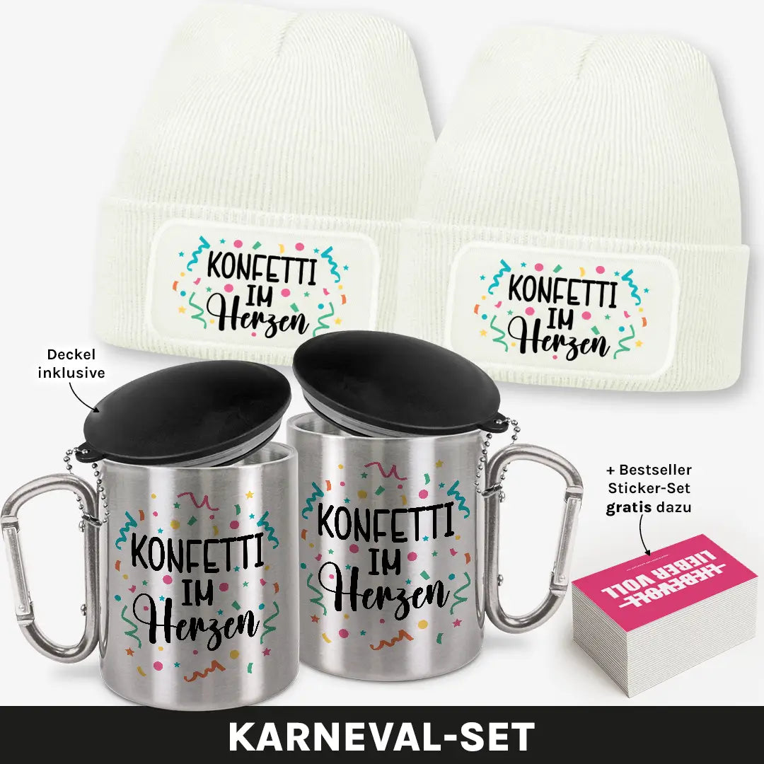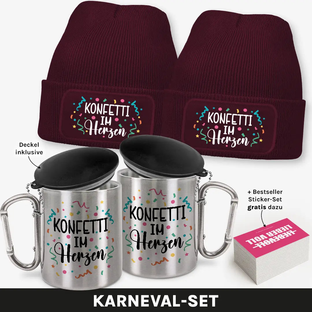 Zwei Beanies, zwei Edelstahlbecher und ein farbenfrohes Sticker-Set – das Karneval Buddy-Bundle für alle, die das Leben feiern, als wär’s ein dauerhafter Rosenmontagszug! 💃🪅 Ob im Umzug, auf der Afterparty oder beim Straßenkarneval – mit diesem Set hast du Konfetti im Herzen und gute Laune garantiert!