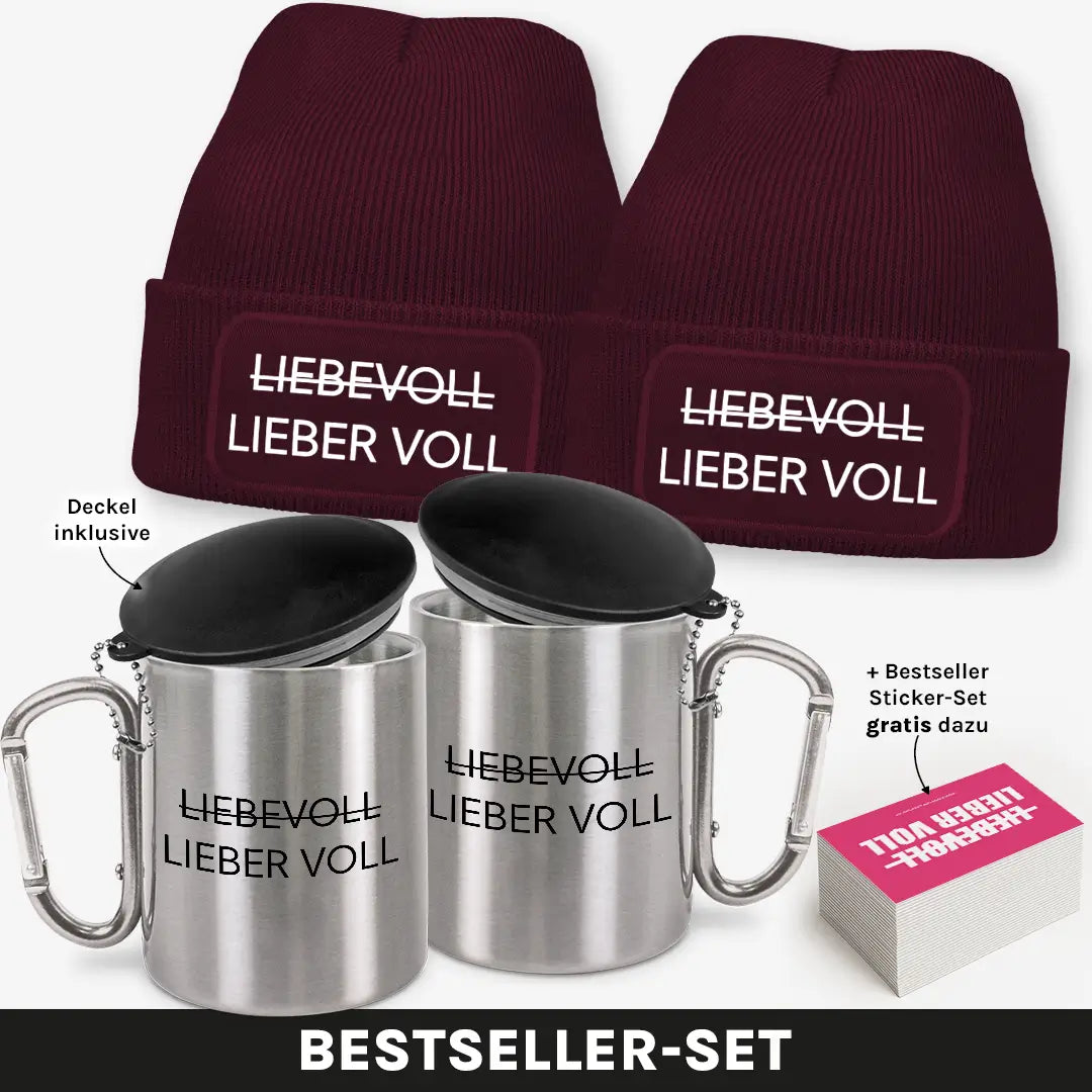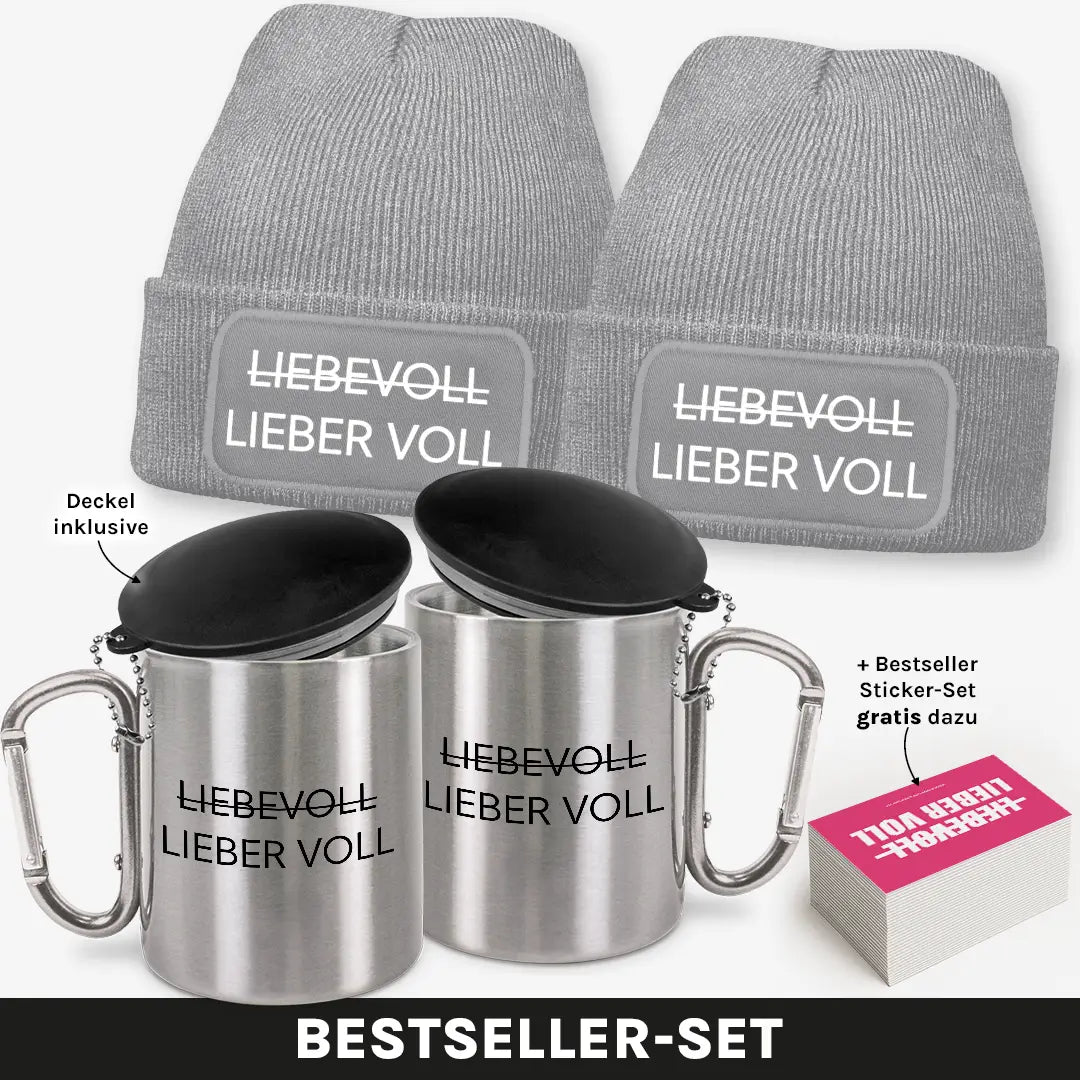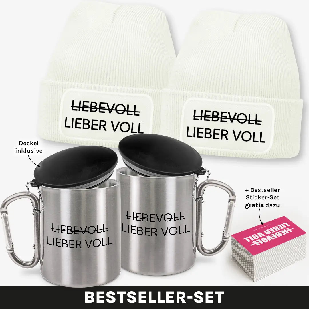 Zwei Beanies, zwei Edelstahlbecher und ein freches Sticker-Set – das ultimative Prozente-Momente-Bundle für alle, die wissen, dass Liebe vergeht, aber Promille bestehen bleiben! 😜 Ob auf dem Festival, beim Après-Ski oder an der Theke – mit diesem Set seid ihr das unschlagbare Team, wenn’s mal wieder lieber voll statt liebevoll heißt.