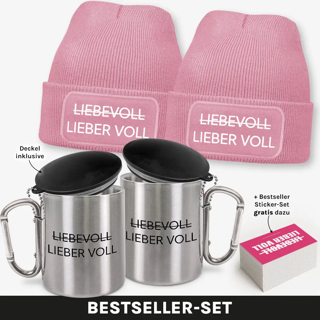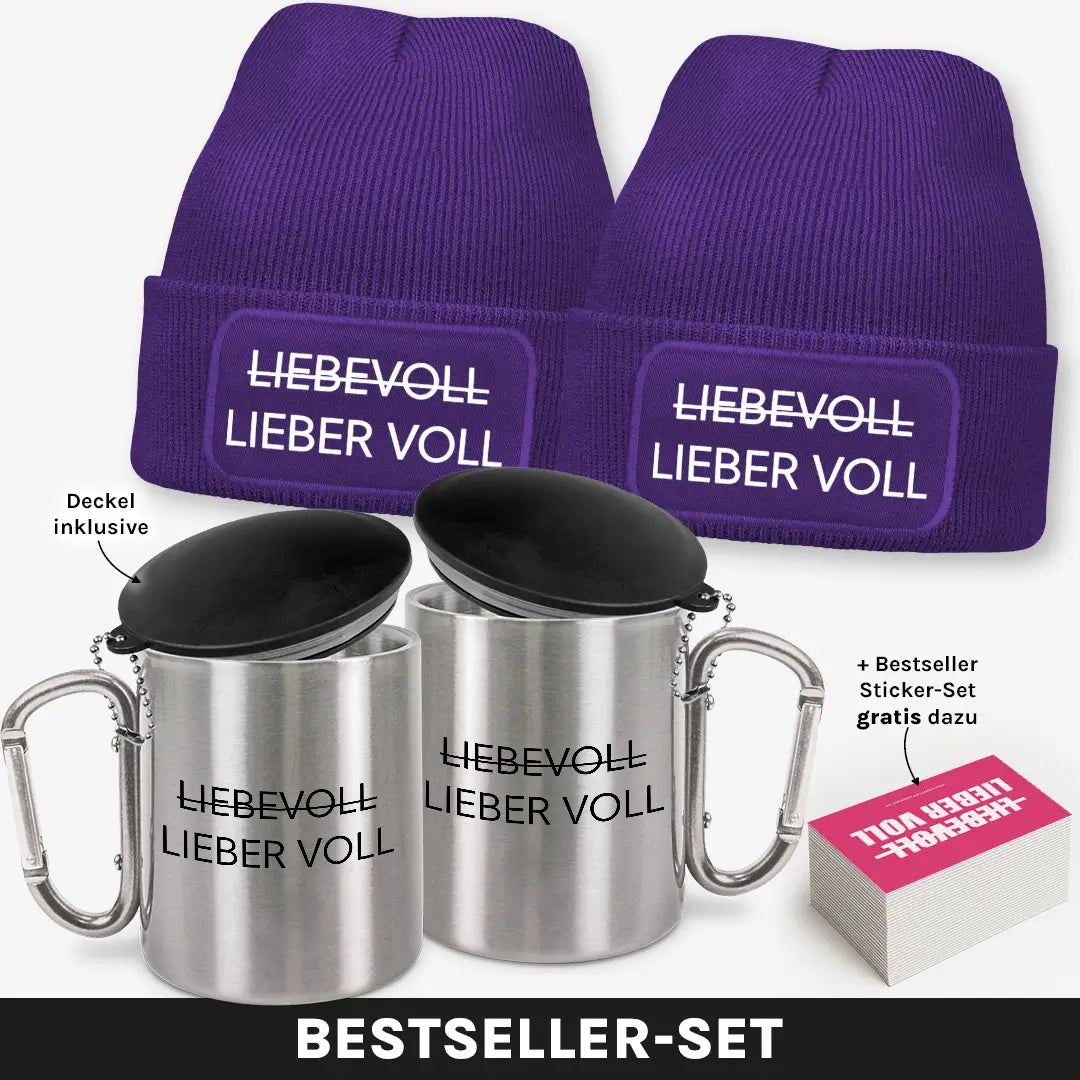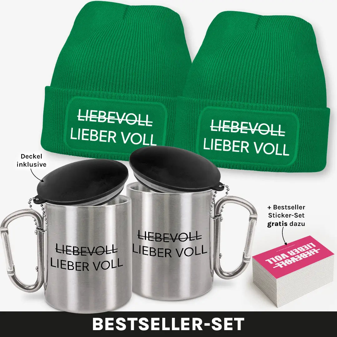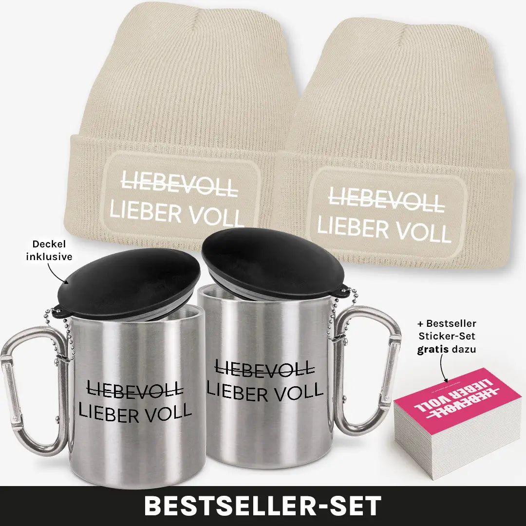 Zwei Beanies, zwei Edelstahlbecher und ein freches Sticker-Set – das ultimative Prozente-Momente-Bundle für alle, die wissen, dass Liebe vergeht, aber Promille bestehen bleiben! 😜 Ob auf dem Festival, beim Après-Ski oder an der Theke – mit diesem Set seid ihr das unschlagbare Team, wenn’s mal wieder lieber voll statt liebevoll heißt.